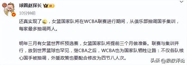 北京时间12月26日,根据媒体人赵探长的报道,女篮国家队将在WCBA联赛进行期间,从俱乐部抽调国手集训,每家最多抽调两人。