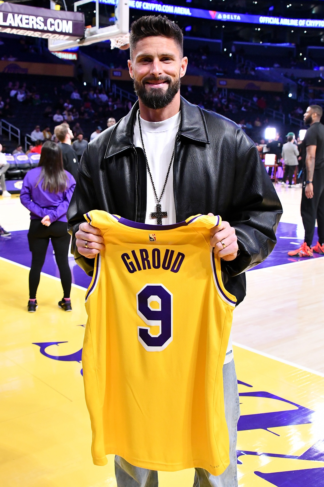 法国足球运动员、现年38岁的吉鲁现效力于洛杉矶银河FC,观战同城球队,获赠湖人9号战袍(吉鲁自己的号码是9号)