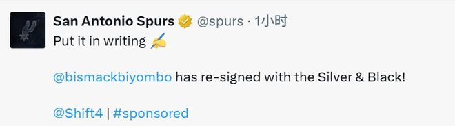 北京时间9月16日,马刺官方宣布,球队已经正式与比永博达成签约协议。Shams此前报道称,这是一份一年合同,而Scotto表示,比永博此次签下的合同为非保障性合同,这意味着在特定日期前,若