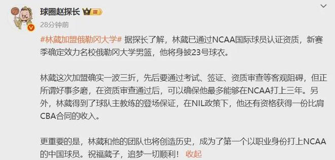 国内媒体人跟进报道称,林葳在俄勒冈大学继续身披23号球衣,得到了主教练的上场保证,并且在NIL政策下有资格获得一份比肩CBA合同的收入,就此成为首位以职业球员身份打进NCAA的中国球员。