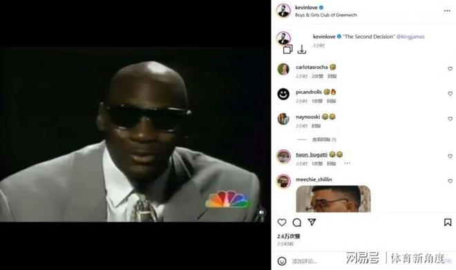 詹姆斯的多年老友乐福,则更是别出心裁,他晒出了乔丹在2003年于华盛顿MCI中心(如今的第一资本球馆)举行的退役仪式上的演讲视频,并打趣地配文道:“决定二,重现江湖。”