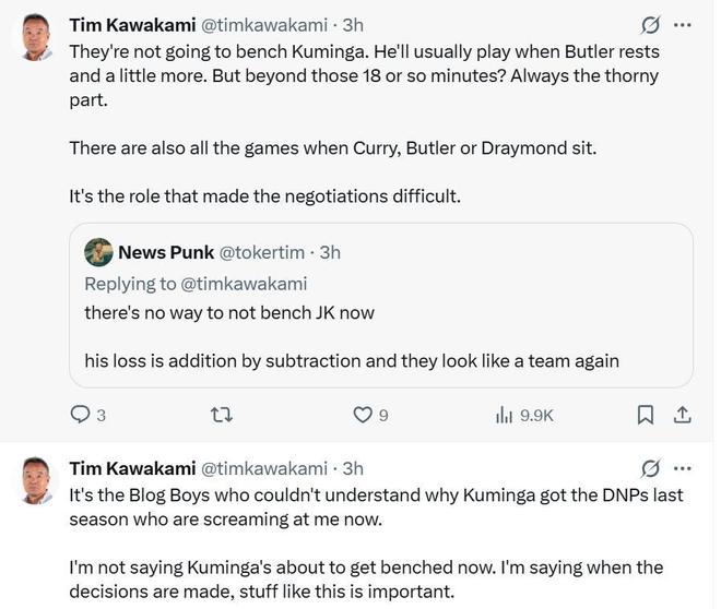正如赛后勇士队记Tim Kawakami所说,库明加很好,但当他不在时勇士也很出色。