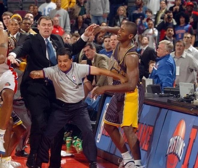 第二名,奥本山宫殿时间,2004年11月19日,步行者和活塞的比赛中难过,阿泰斯特在技术台上,一名球员向他泼啤酒,性格火爆的阿泰哪里能忍受这种事,当即就冲过去和球迷扭打在一起,后来包括杰克逊,小奥尼尔等人接连加入,这件事是NBA历史最大冲突事件,最终导致阿泰斯特等人被禁赛数十场,影响非常恶劣!