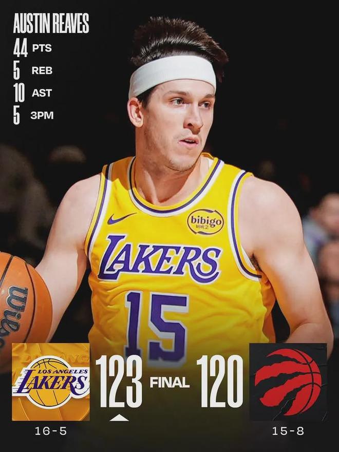 北京时间12月5日,依靠着八村塁的三分绝杀,湖人123-120险胜猛龙。湖人后卫里夫斯21投13中,三分11中5,罚球15中13,得到44分5篮板10助攻,正负值+6并列全场最高。本赛季至今,里夫斯场均