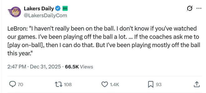 Lakers Daily写道:“别再试图让詹姆斯成为追梦格林,让他做自己,让其他人来适应他。”