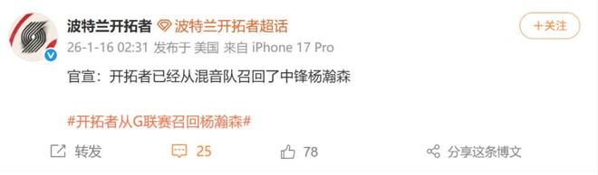 北京时间1月16日,NBA常规赛争夺继续,开拓者117-101老鹰,此役开拓者队赛前召回昨天在G联赛带队取胜的杨瀚森,却没有给他登场机会,在阿夫迪亚持续伤缺的情况下,夏普带领开拓者早早建