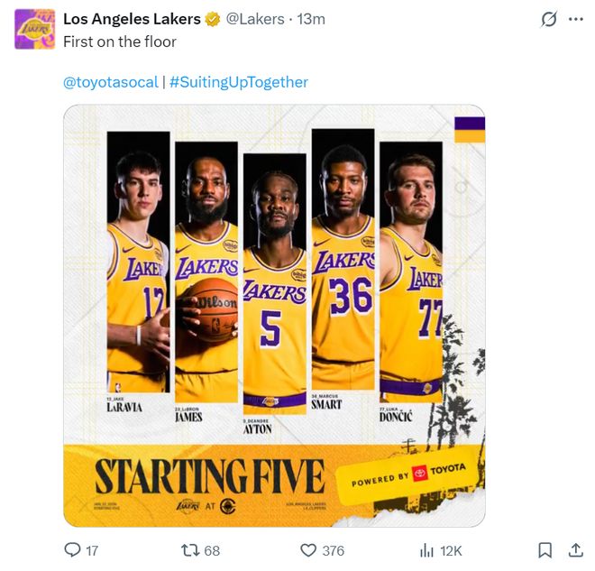 这场比赛湖人的先发阵容不变,艾顿虽然眼部受伤还是带伤鏖战。