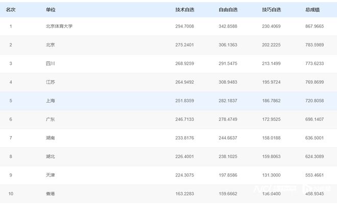 本届全运会花样游泳集体项目由技术自选、自由自选、技巧自选三项组成,其中技术自选与自由自选已于11月13日完赛,11 月 14 日的技巧自选为最后一项角逐。北京体育大学队在前两项已建立优势的基础上,凭借技巧自选的稳定发挥,最终以总分867.9665分成功登顶;北京队、四川队分别以783.5989分、773.6233分位列第二、三名。广东队位列第六位。