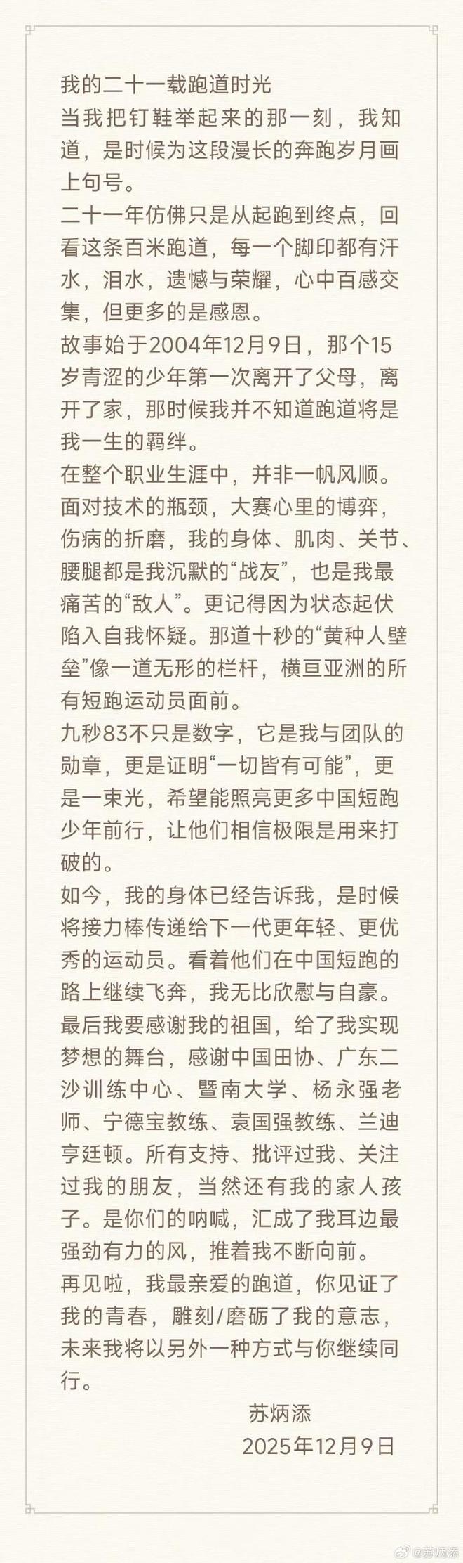 12月9日,苏炳添在个人账号上发布长文《我的二十一载跑道时光》: