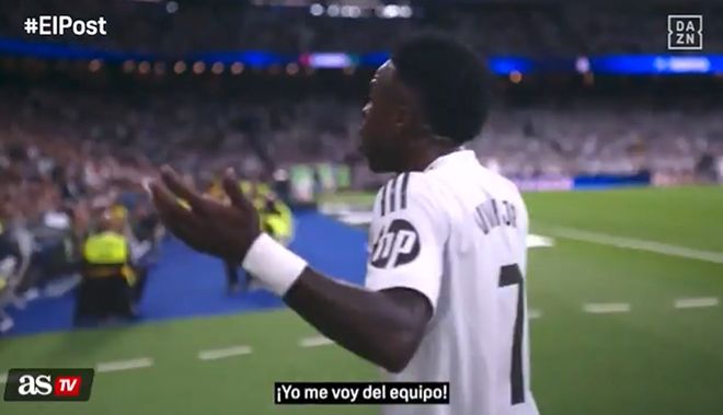 赛后根据DAZN发布的视频,在得知要被换下的是自己时,维尼修斯立即露出了惊讶和错愕的表情,随后连着说了几次:“换我?换我?我吗?”紧接着是一句来自巴西的国骂“Vai tomar no culo!”大致可翻译为“去你XX的!”