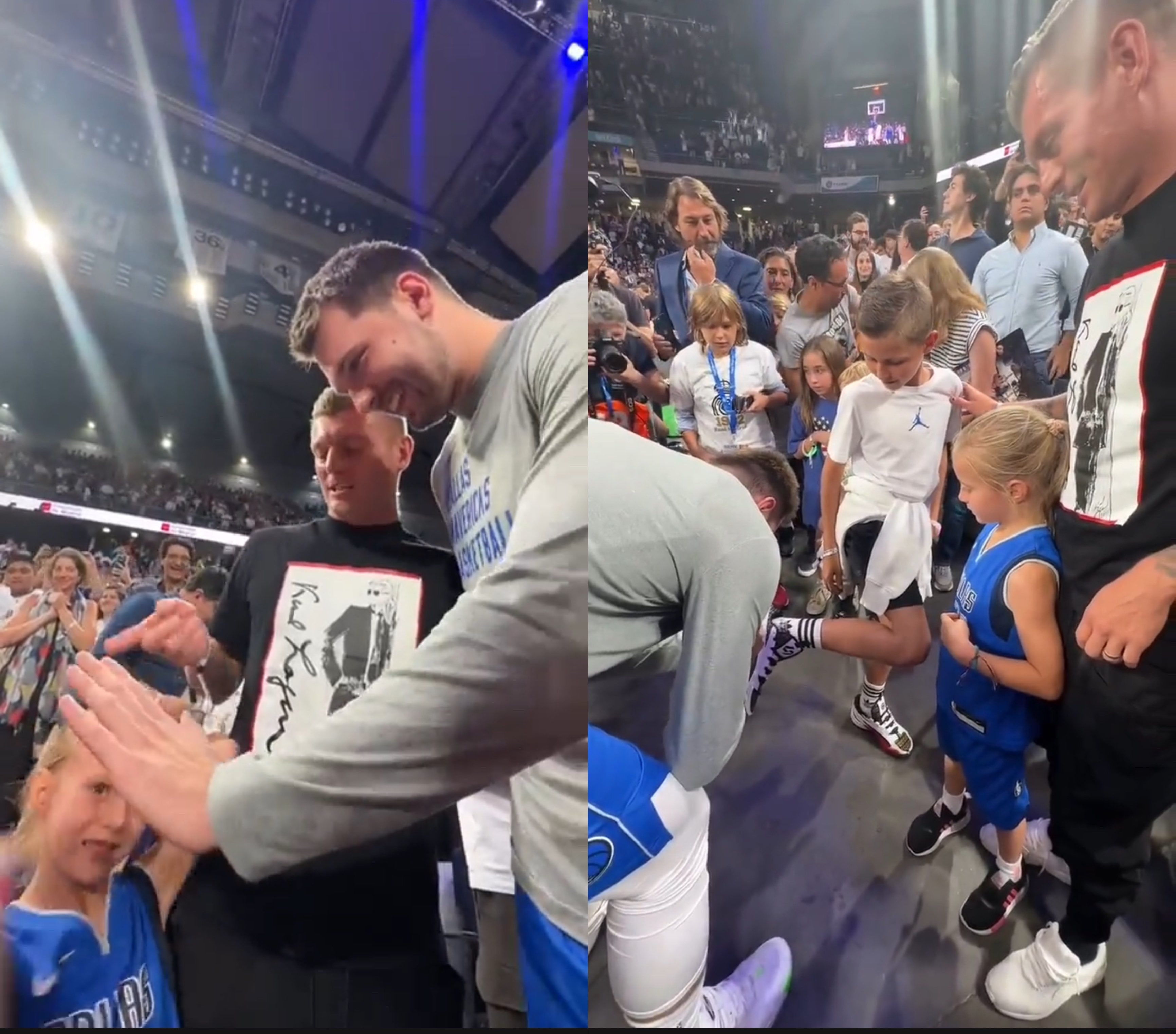 独行侠战皇马篮球队,东契奇现场给克罗斯儿子的球鞋签名