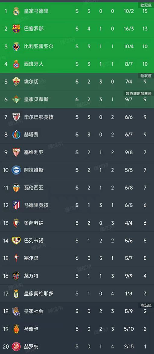 北京时间9月22日,西甲第5轮结束了所有比赛,最新积分榜如下!