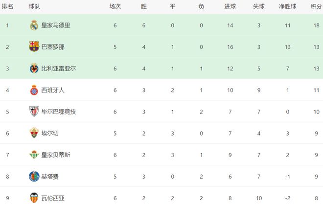 在积分榜上,6战全胜的皇马拿到18分,高居榜首。巴萨4胜1平,拿到13分,排名第2。虽然巴萨落后5分看起来有点多,但比皇马少赛一场。比利亚雷亚尔也是13个积分,排名第3。第4的是西班牙人,拿到11分。毕尔巴鄂竞技以10分排名第5。埃尔切、皇家贝蒂斯和赫塔费都是9分。