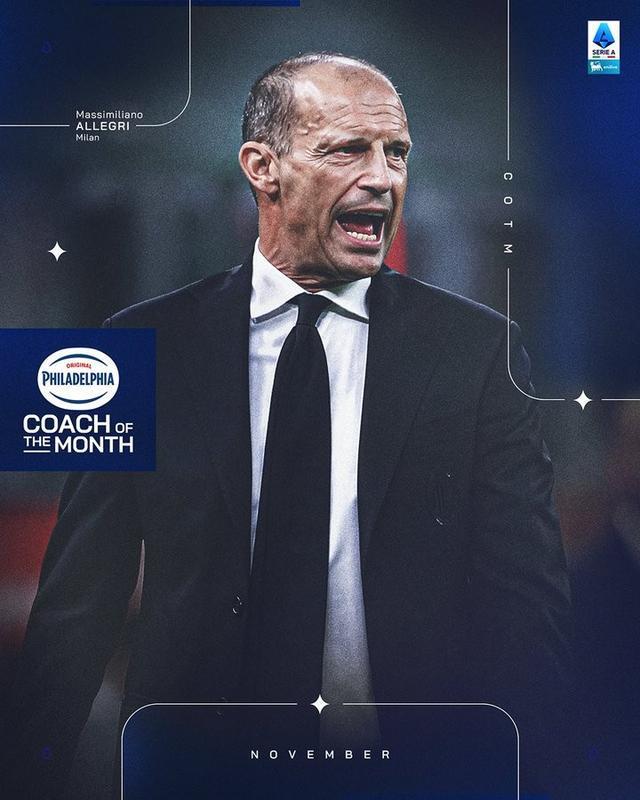 北京时间12月12日,意甲官方宣布,AC米兰主帅阿莱格里当选联赛11月最佳球员。