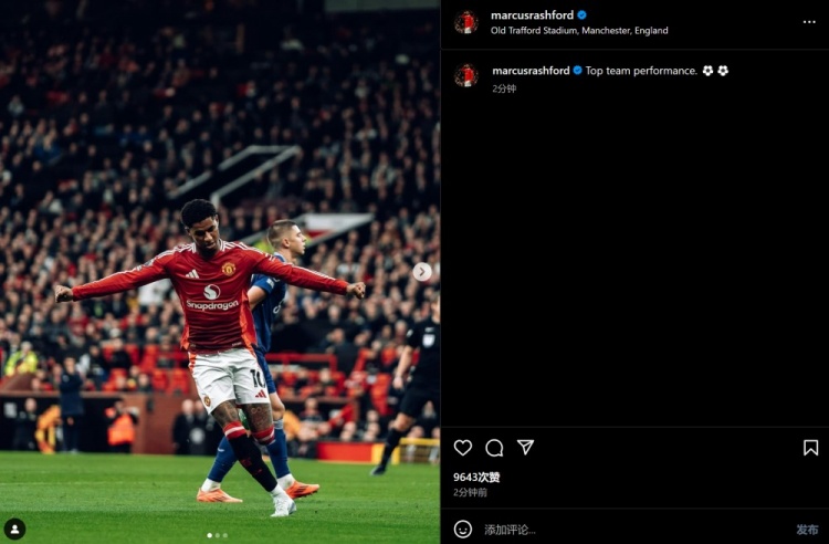 12月2日讯 本轮英超比赛中,曼联主场4-0大胜埃弗顿。本场比赛,拉什福德完成双响。赛后,他更新社媒庆祝球队取胜,称赞了球队的表现。