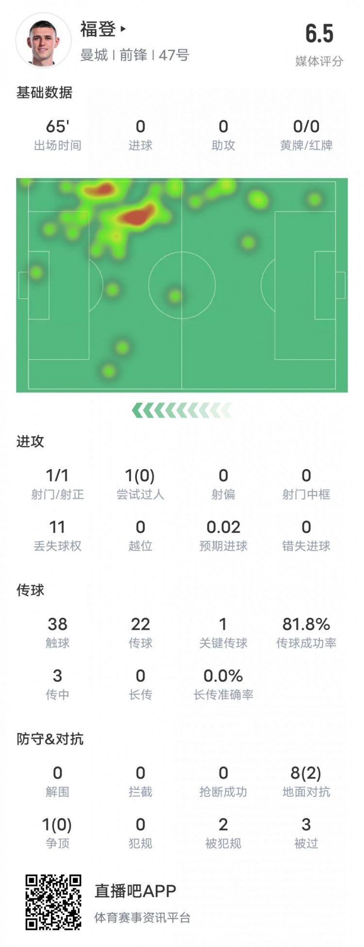 福登本场比赛具体数据如下: