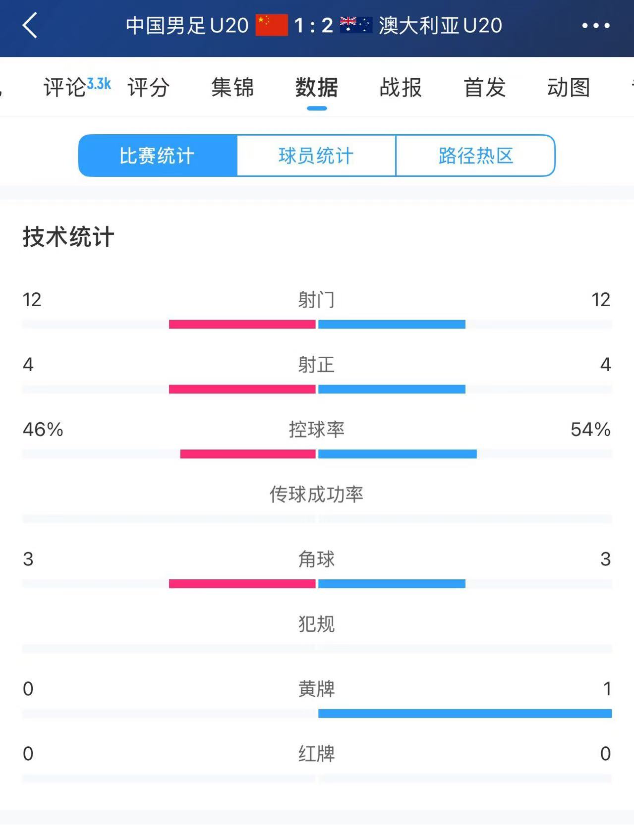U20国足vs澳大利亚全场数据:双方均有12次射门、4次射正