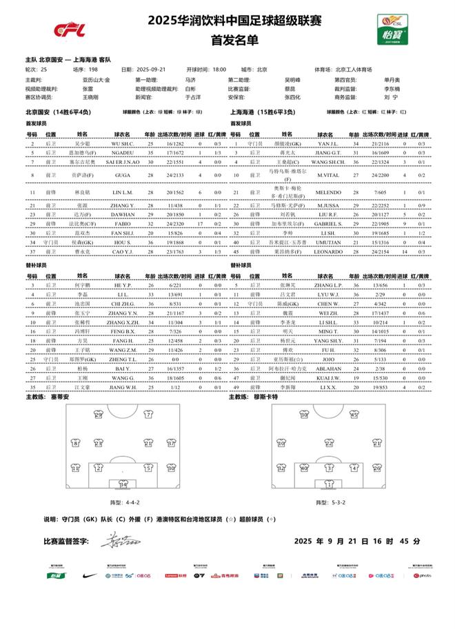 北京时间9月21日18:00,中超第25轮焦点大战,北京国安主场迎战上海海港。澳大利亚主裁亚历山大-金执法,张雷出任VAR。赛前,双方首发公布如下: