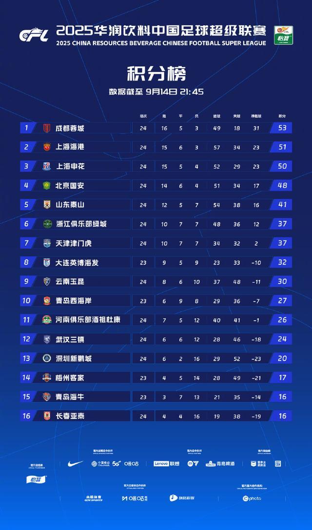 9月21日晚,中超联赛第25轮,两场天王山战役或会提前揭晓夺冠悬念:上海申花主场迎战成都蓉城、北京国安主场交锋上海海港。目前,成都蓉城、上海海港、上海申花、北京国安暂列前四,积分分别为53、51、50、48分。