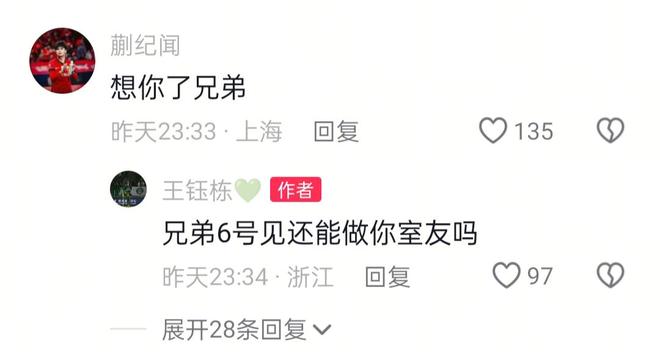 上海海港队员蒯记闻评论到:“想你了兄弟!”王钰栋回应到:“兄弟6号还能做你室友吗。”两人虽分别效力两家中超俱乐部,但在国家队两队同队许久,关系紧密。