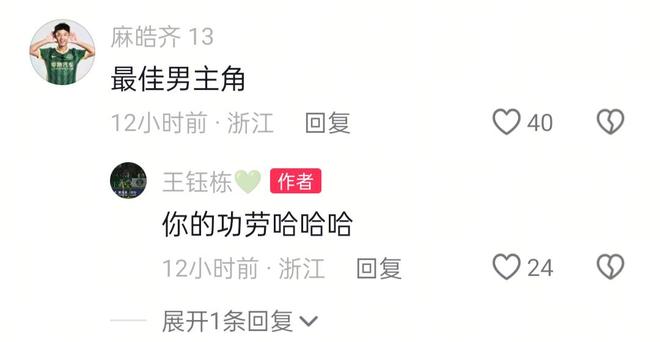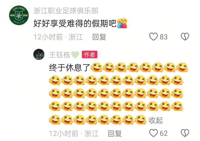 浙江队官媒评论到:“好好享受难得的假期吧。”王钰栋回应道:“终于休息了。”
