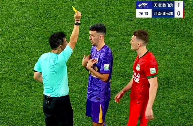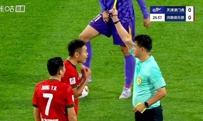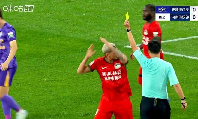 上半场双方战成0-0,主裁判共出示5张黄牌,河南队4张,津门虎1张,球迷调侃:“新卡牌大师出现了!”