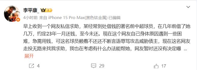 雷速体育9月29日讯 媒体人李平康在社媒爆料,某位前著名中超球员从球迷处借钱至今未还,如今当事人球迷患病急需用钱。却被球员不断言语辱骂攻击。