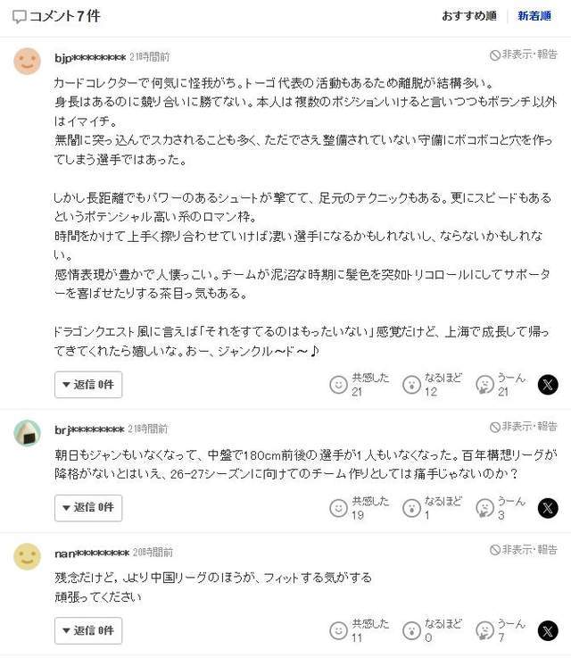 不难看到,几乎清一色的日本球迷都对让克劳德离开感到失望和遗憾,认为他是很有潜力的球员。我们也期待22岁的多哥后腰能成为新赛季中超的最大惊喜!(老邱)
